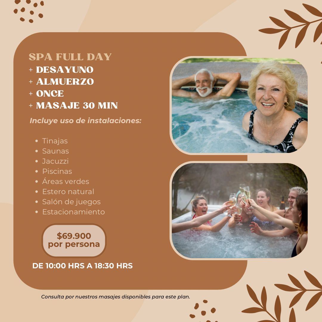 Una experiencia completa para quienes desean aprovechar el día al máximo. Incluye desayuno, almuerzo, once y un masaje de 30 minutos. Es el plan más completo para regalar o regalarte una jornada perfecta.